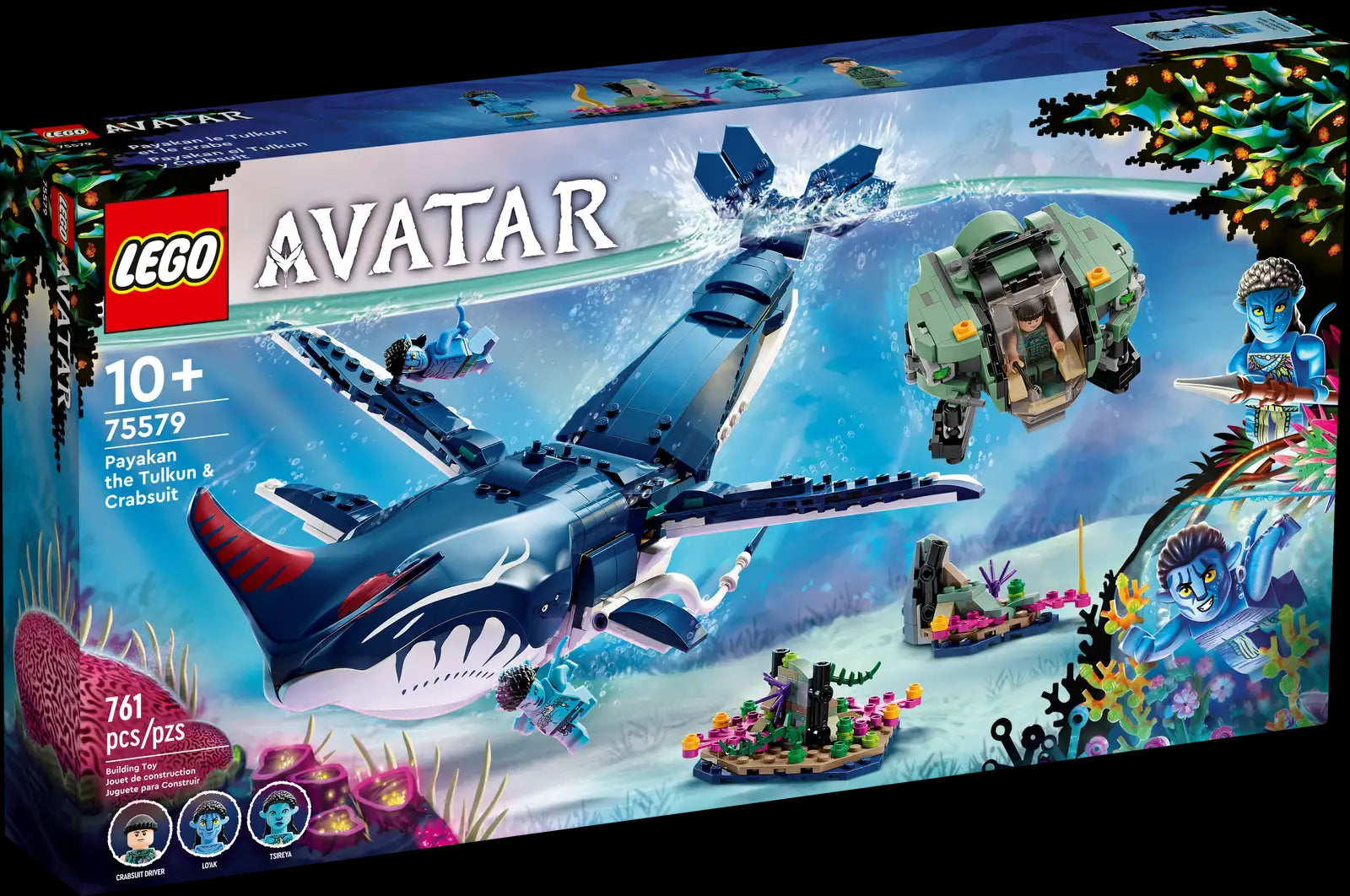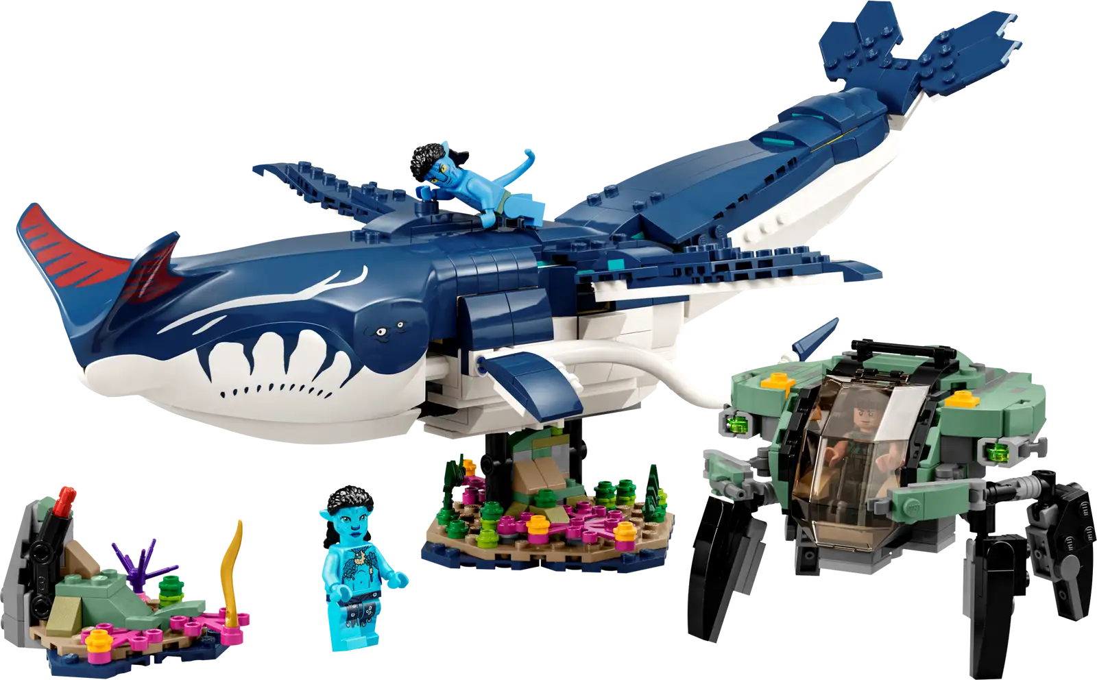 - What’s in the box – Includes a posable tulkun, crabsuit submersible, 2 seabed settings and a display stand, plus Lo’ak, Tsireya and Crabsuit Driver minifigures